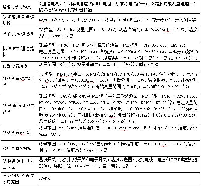 • 电测信号路数与种类:6通道电测,2路标准通道(标准热电阻、标准热电偶各一)、2路多功能测量通道、2路被检热电偶+电流测量通道;
